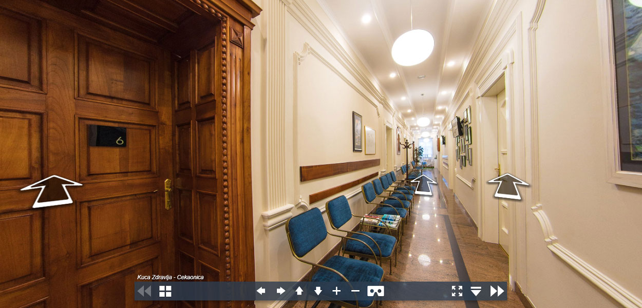 Klikom na strelice, možete „ušetati“ u prostorije Centra za lasersku hirurgiju oka Perfect Vision. Pomeranjem levo-desno i gore-dole možete razgledati prostor 360. U dnu ekrana su male slike koje prikazuju svaku prostoriju. Klikom na svaku od njih možete „ući“ u prostoriju koja Vas interesuje.