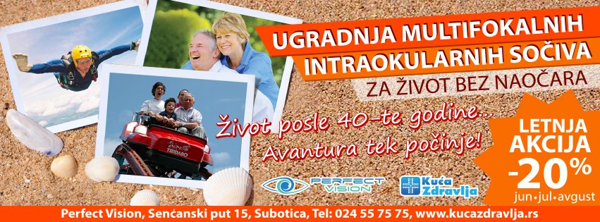 Život nakon 40-te godine postaje prava avantura! Ne dozvolite da vas problemi sa vidom sprečavaju da joj se prepustite! Iskoristite letnji popust od 20% na ugradnju multifokalnih intraokularnih sočiva i obezbedite sebi odličan vid na daljinu i na blizinu bez nošenja naočara.