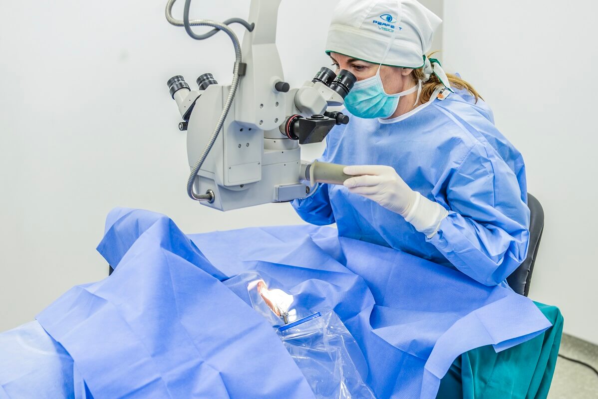 Operacija se vrši u lokalnoj anesteziji koja se daje u obliku kapi (bez injekcija i šavova), bezbolna je i traje oko 10 minuta.
