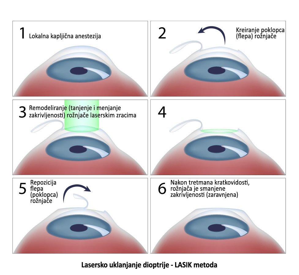 • kod LASIK metode se posebnim uređajem (mikrokeratom) vrši zasecanje epitela, praveći „poklopčić“ koji se po završetku delovanja laserskih zraka, vraća na mesto i zarasta u roku od jednog dana.