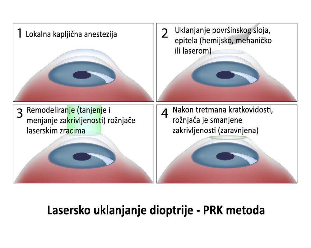• kod PRK metode epitelnom četkicom se uklanja epitel, a po završetku operacije se postavlja terapijsko kontaktno sočivo koje ostaje na oku par dana dok epitel ne zaraste.