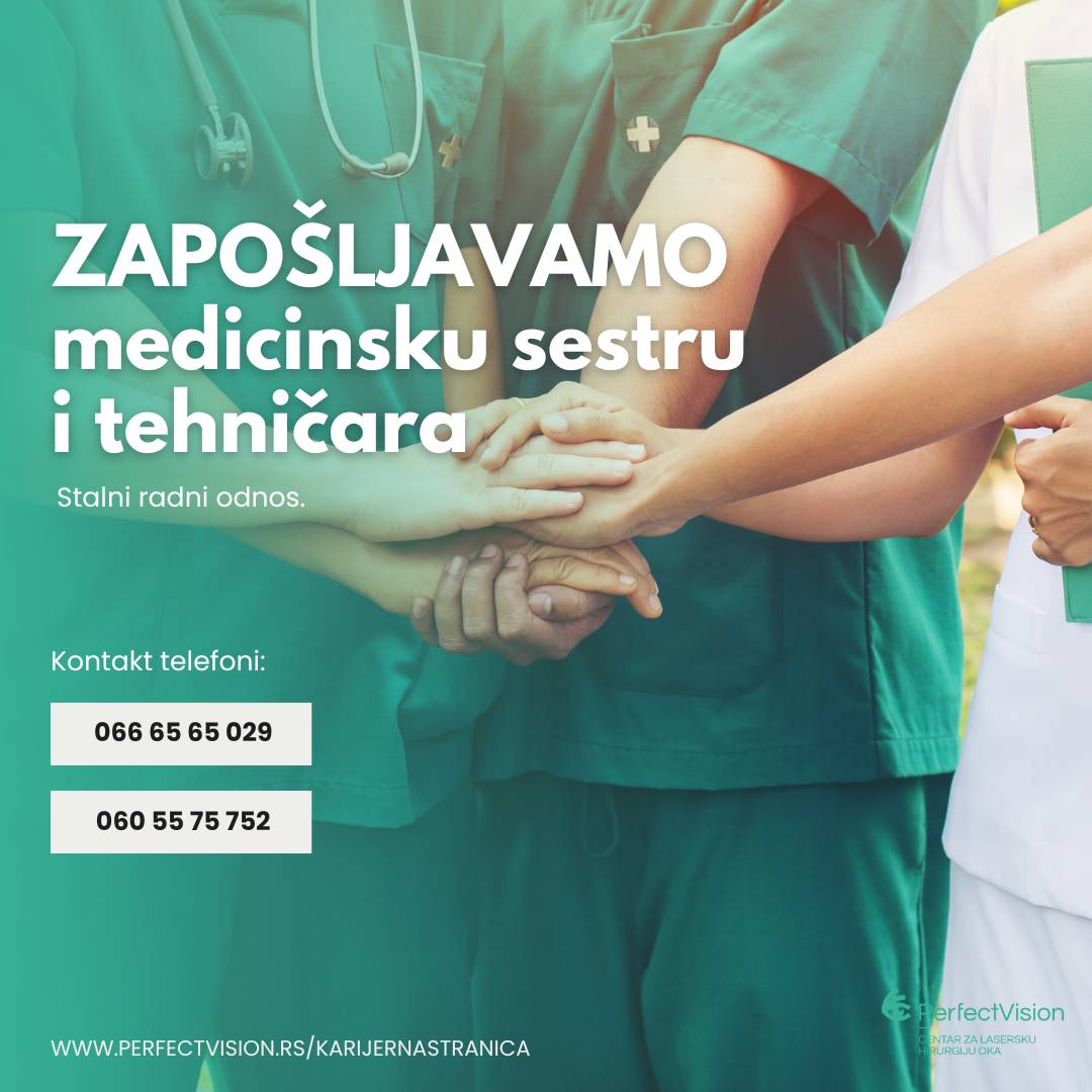 Mi u Perfect Vision-u negujemo iskrenu ljubav prema našem poslu. Vrednosti koje svi delimo su empatija, posvećenost i rad na sebi. Naši zaposleni imaju mogućnost da rade sa najnovijim tehnologijama i da stiču znanja od najvećih stručnjaka iz oblasti oftalmologije – jer je inovativnost ključna u našem poslu. Važno nam je da kontinuirano ulažemo u naše zaposlene i zato im pružamo odlične uslove za rad, uključujući konkurentne zarade, personalizovane benefite i mogućnosti za razvoj karijere. Svi zajedno stvaramo prijatno i profesionalno okruženje u kojem se dobro osećaju i naši zaposleni i naši pacijenti.