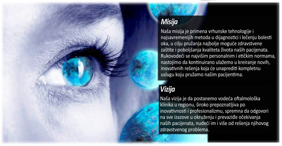 Naša misija je primena vrhunske tehnologije i najsavremenijih metoda u dijagnostici i lečenju bolesti oka, u cilju pružanja najbolje moguće zdravstvene zaštite i poboljšanja kvaliteta života naših pacijenata. Rukovodeći se najvišim personalnim i etičkim normama, nastojimo da kontinuirano ulažemo u kreiranje novih, inovativnih rešenja koja će unaprediti kompletnu uslugu koju pružamo našim pacijentima.