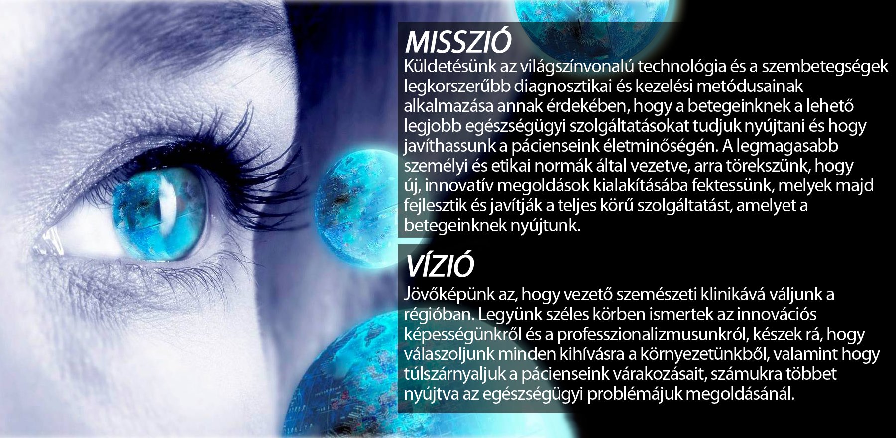 Küldetésünk az világszínvonalú technológia és a szembetegségek legkorszerűbb diagnosztikai és kezelési metódusainak alkalmazása annak érdekében, hogy a betegeinknek a lehető legjobb egészségügyi szolgáltatásokat tudjuk nyújtani és hogy javíthassunk a pácienseink életminőségén. A legmagasabb személyi és etikai normák által vezetve, arra törekszünk, hogy új, innovatív megoldások kialakításába fektessünk, melyek majd fejlesztik és javítják a teljes körű szolgáltatást, amelyet a betegeinknek nyújtunk.
