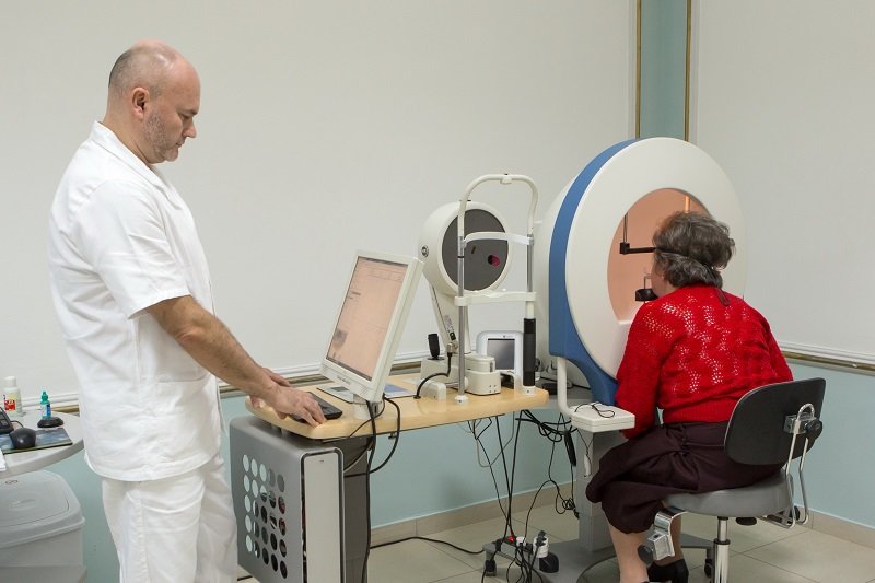 Computerized visual fieldAuf dem Oculus Twinfield 2 computerisierten Blickfeld macht man Funktionsueberpruefung des Blickfeldes, nach dem man auf dem graphischen Bericht eventuelle Ausfaelle bemerken koennen. Die hauefigste Anwendung hat bei der Glaucomuntersuchung eine grosse Anwendung, weil auf dem Apparat anbrechene Aenderungen der Krankheit bemerken koennen,die der Patient meistens selbst nicht bemerken kann. Man benutzt auch bei neurilogischen Untersuchung, wie bei der Ueber-Pruefung der Makulefunktion, wenn man auf eine Alter Degeneration verdaechtigt.