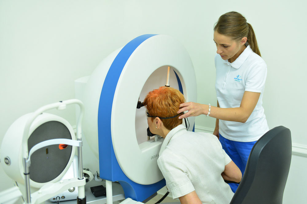 En Oculus Twinfield 2 campo visual computarizado se realiza el examen de la funcionalidad del campo visual, después de lo cual en el gráfico se pueden percibir las posibles incorrecciones. Se usa mayormente para examinar glaucoma, porque en el aparato pueden verse los cambios iniciales de la enfermedad, a los cuales con mayor frecuencia el paciente no puede percibir solo. Se usa también para los exámenes neurológicos, así como para comprobar la funcionalidad de la mácula, en el caso de sospechar de la degeneración causada por la edad.